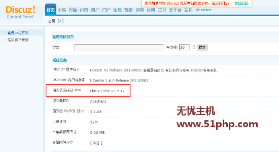 在设置伪静态之前,我们需要确定自己的运行环境。那么如何确认呢?其实discuz有一个自带检测环境的功能。我们只需要登陆网站后台,首页——管理中心首页——系统信息,就可以看到当前的服务器配置和php版本了,如图所示: