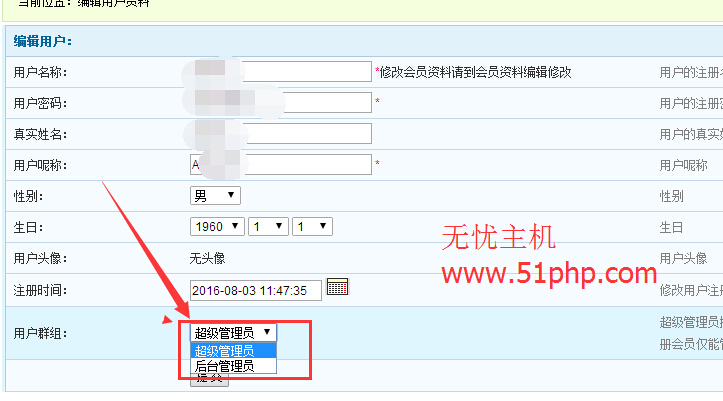 这里的信息其实和会员资料编辑资料非常相似,唯一不同的就是可以再最后修改用户所在的用户组从而给用户分配不同的权限。