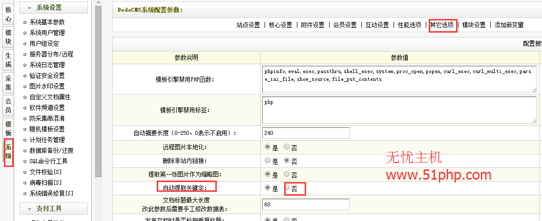 站长朋友们经常在PHP空间使用织梦dedecms搭建网站都知道网站后台有个提取关键词的功能,这是织梦程序系统默认自带的,有的站长朋友们如果不需要都会在后台关闭掉,一般关闭的方法就是登陆织梦后台,找到系统-->系统基本参数-->其他选项-->自动提取关键字-->否。详细无忧主机小编来截图看下:如下图1: