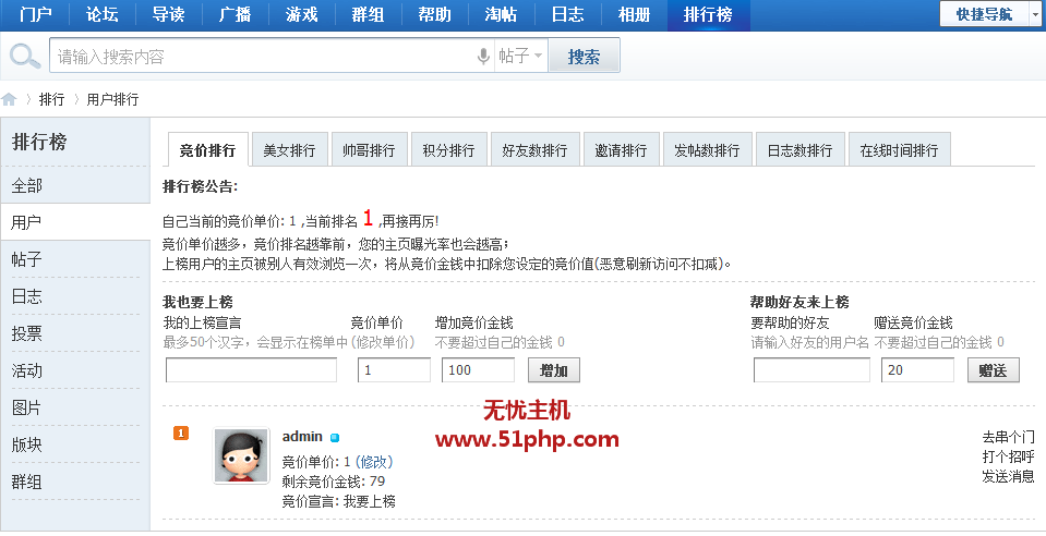 2、 通过竞价排行,可以增加用户的活跃度。鼓励用户发帖,回复。等一些列操作赚取“论坛金钱”