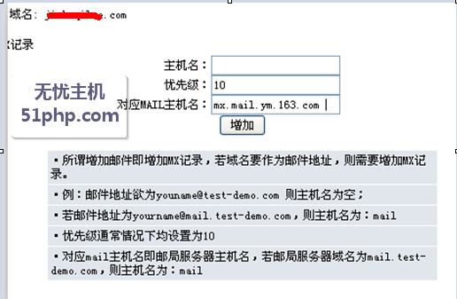 对应MAIL主机名:mx.mail.ym.163.com (填写您的企业邮箱默认的mail主机名)