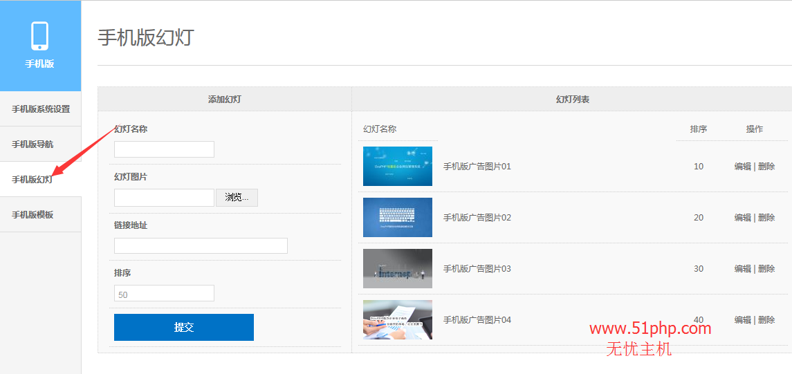 在“手机版幻灯”页面可以设置手机站点的幻灯片广告图片信息,这个幻灯片的使用方法和之前无忧主机小编介绍的电脑端的幻灯片使用是一样的,这里就不多复述了,如图3所示: