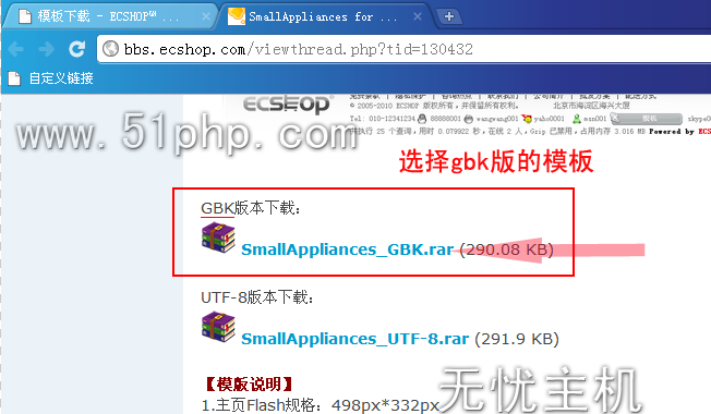 1、首先请到ecshop官方论坛挑选自己心仪的模板,然后下载到本地。我选择了一个下载量最高的由作者水上漂制作的模版,模版名为smallapliances,选择gbk模版下载到本地。