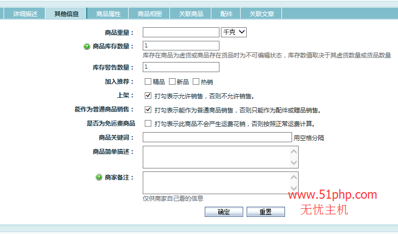 在其他信息板块我们可以设置新商品的库存数量、是否加入推荐、能否作为普通商品销售、商品关键词和描述等等,如图2所示: