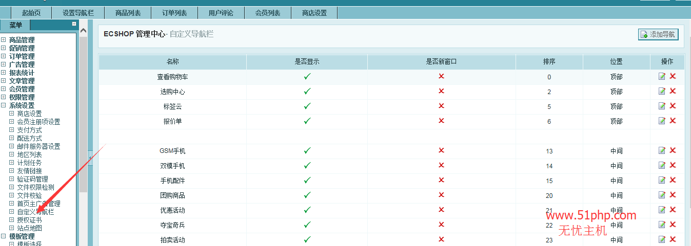 ecshop程序的页面导航栏是可以直接在网站的后台中进行自定义修改和设置的,非常的方便,这样就可以免去了我们在代码源文件中修改代码的麻烦,所以这个时候就我们就需要使用到网站后台的自定义导航栏功能了。下面无忧主机小编就来给大家详细介绍一下,如何在独立ip虚拟主机环境下使用ecshop网站后台的自定义导航栏功能。