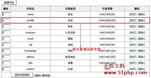 小编做了一个信息反馈表字段(姓名:name 联系邮箱:email 联系电话:call 作品名:title 作品:tranfile 作品简介:saytext)在帝国cms中反馈表中的除了作品(tranfile)”字段外,其它字段均已存在,所以下面我们就只需增加“作品”字段: