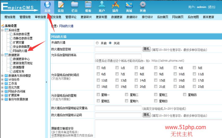 有很多的站长朋友最担心的就是自己的网站安全系数不高,容易被人登入后台盗取信息,但是帝国程序的网站防火墙功能可以有效提升我们网站的安全系数。首先我们登入帝国程序的网站后台,依次点击菜单栏导航的“系统”--“网站防火墙”进入防火墙设置页面