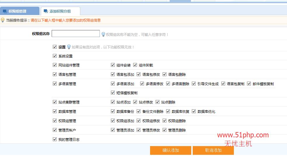 点击页面左上角的“添加权限分组”按钮可以添加新的权限组,在出来的添加权限分组窗口中,根据我们自己的实际需要设置权限分组,然后点击“确认添加”按钮就可以了。还有就是我们在添加组件权限的时候需要注意一下,如果子主功能取消了使用,那么子功能也使用失效的。如图2所示: