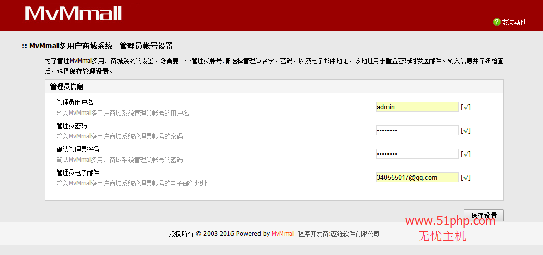 之后进入管理员帐号设置页面,这里需要输入网站管理员的帐号和密码,这个帐号信息大家自行设置,最后点击“保存设置”按钮,如图3所示: