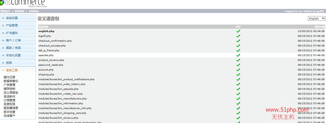 在oscommerce建站系统里面,我们除了可以通过将语言包上传到PHP虚拟主机中来设置不同的系统语言之外,还可以对上传的语言包进行自定义的修改和编辑,但是这个需要懂得代码方面的技术,对于技术好的站长朋友们来说,自定义修改。下面无忧主机小编来给大家介绍一下,在oscommerce建站系统后台定义语言包的方法。