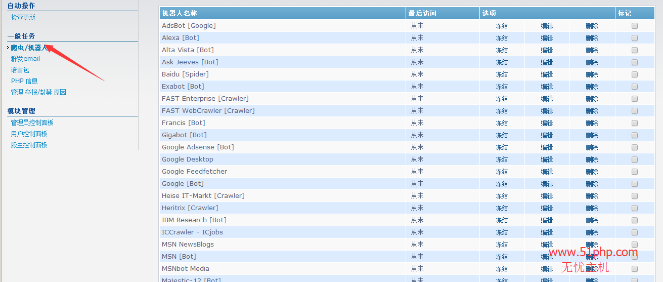 搜索引擎的“机器人”、“蜘蛛”以及“爬虫”这些东西的作用相信各位站长朋友们都非常清楚,它们是搜索引擎用于更新其数据库的自动工具。但是凡事都有利弊,搜索引擎的机器人也不例外,因为这些小东西会贪婪地使用对话数量, 导致奇怪的访客数量, 增加论坛负载, 严重的话甚至会导致论坛短时间内访问受阻. 那么这个时候就需要网站管理人员来定义一系列特殊用户来预防这些问题的发生。所以接下来无忧主机小编就给各位站长朋友详细的介绍一下,如何在php空间环境下,使用phpbb系统后台的“爬虫/机器人”功能。