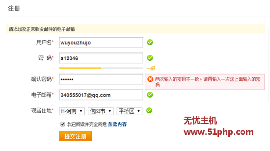 无忧小编最近又开始在开始捣腾自己在无忧主机php空间上的Phpwind,而在今天终于大功告成了,于是把网站发给了我朋友和群友看看需要什么改进的地方。过去了十分钟我朋友告诉我说:点击注册时候输入密码然后输入确认密码的时候显示“两次输入的密码不一致。请再输入一次您上面输入的密码 ”如下截图: