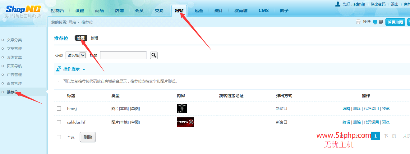 新的推荐位设置好了之后,点击“网站”--“推荐位”--“管理”返回推荐位管理页面,在这里可以对已经添加的推荐位信息进行统一的管理操作。点击操作栏下的调用代码按钮,即可复制推荐位代码放在商城前台进行展示,如图2所示: