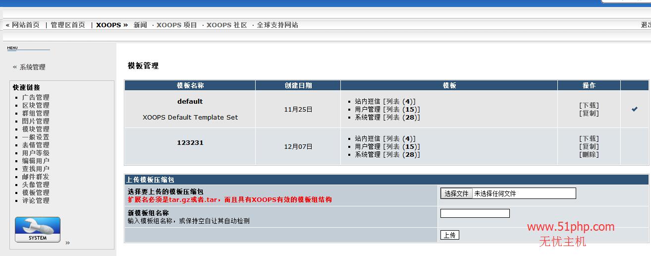点击页面中的“上传文件”按钮,选择需要上传的模板压缩包,压缩包必须是tar.gz或者.tar的扩展名,而且必须是XOOPS支持的有效模板组结构。上传后的模版文件就会显示在当前的这个页面中,我们可以下载、复制或者删除上传的模版文件,注意系统默认的模版是不可以删除的,只能复制或者修改。